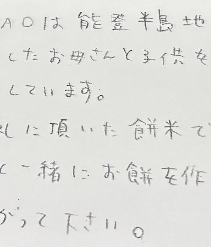 今回は、何日にもわたって準備を重ね、つながりの中でいただいた餅米を使って、子どもたちが一つひとつ手で丸めてくれたお餅も一緒に届けました。